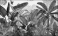 Tropical plants wallpaper design, Jungle background, big leaf and bird, back yard, landscape, mural art.