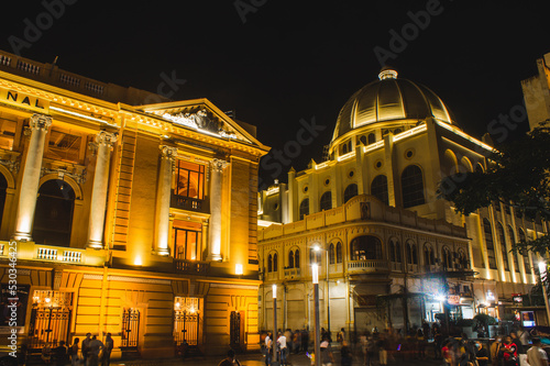 Fototapeta - san salvador cathedral and san salvador theater at night on a rainy day