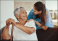 >Plakat>Happy, relax and senior woman with caregiver smile while sitting on a living room sofa in a nursing home. Support, help and professional nurse or healthcare worker helping elderly lady or patient