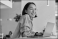 >Plakat>Pretty cheerful Asian woman in eyeglasses and casual clothes browses laptop computer connected to 4g internet updates software uses modern technologies poses in cafeteria looks gladfully away