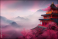 Fototapeta - Chinese temple on a foggy mountain with sakura trees