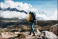 Fototapeta - Solo hiker wearing professional and trekking poles walk across sunny mountain track. Young tourist traveling along rocky trek