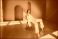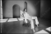 >Plakat>Front view of confident female model ,dressed in white formal suit and heels, sitting on chair and posing at camera on background of wall with minimalism design elements