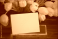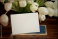 Bukiet tulipanów w tle, a na pierwszym planie biała kartka - zaproszenie z miejscem na tekst. Kwiaty i tekst. Dzień Kobiet.