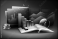 Fototapeta - Tło dla firmy związanej z biznesem, giełdą, pieniędzmi. Biurko w ekskluzywnym biurze. Zachód słońca wpadający przez okno. Generative AI