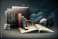 Tło dla firmy związanej z biznesem, giełdą, pieniędzmi. Biurko w ekskluzywnym biurze. Zachód słońca wpadający przez okno. Generative AI