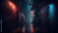 >Plakat>3D rendered computer generated image of a futuristic neo cyberpunk urban alleyway. Bright blue light in empty alley with no people. Inner city buildings and modern architecture look and feel