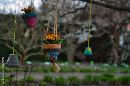 colorful ceramic pots painted in spring patterns hanging on a tree on strings in the garden