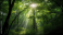 Fototapeta - A green forest canopy, with shafts of light streaming through the leaves.