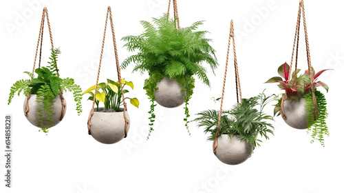 Zestaw izolowanych kwiatów w wiszących doniczkach na przezroczystym tle, AI generated.