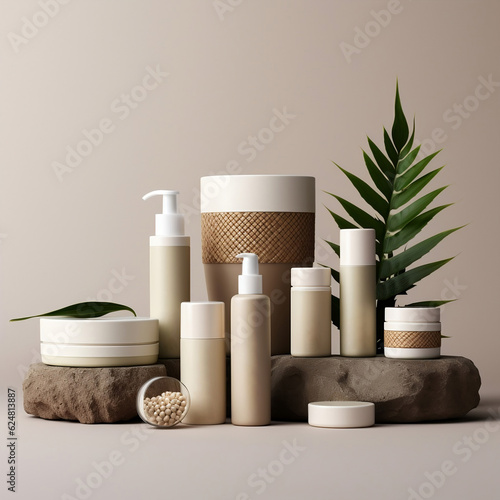 environmentally friendly Blank cosmetic product line with white color and copy space makeup, and skin care items