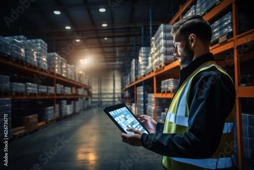 Fototapeta - Smart warehouse, inventory management system concept, a manager using digital tablet showing warehouse software management dashboard on the blurred warehouse as background