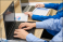 Fototapeta - Dwie osoby siedzące przy biurku, piszące na komputerze