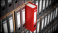 Red folder standing out among black ones inside wooden shelves. 3D illustration