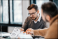 Two colleagues are sitting at the meeting room and discussing charts and statistics.