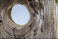 Dziura po sęku w starej spruchniałej desce będącej składnikiem (częścią) płotu.