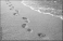 Fototapeta - Footprints of human feet on the sand near the water on the beach