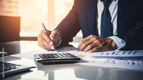 Fototapeta - Accountant working on desk using calculator for calculate finance report in office