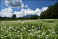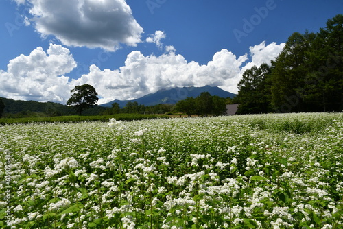 Fototapeta - 開田高原 白いそばの花と青い空、白い雲