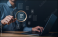 >Plakat>business, document, management, corporate, file, information, laptop, folder, professional, organization. close up to businessman, one hand typing keyboard, another hold magnifier to search document.