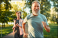 Fototapeta - Cardio training. Close up of energetic fit sportsman spending morning in park and jogging together with wife. Active pensioners taking care of health and doing regular physical activities on nature.