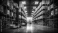 Panorama of huge distribution warehouse with high shelves with forklift at large warehouse.