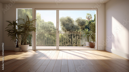 Fototapeta - Pusty biały pokój z dużym oknem i drewnianą podłogą