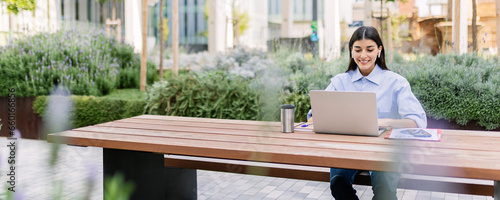 >Plakat>Young business woman studying master on laptop sitting outside of his office. Millennial adult student listening training online business class on computer. Banner aspect.