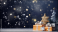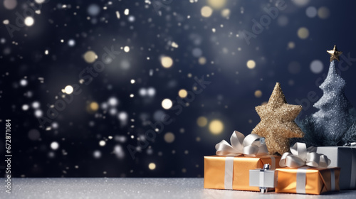 Świąteczne tło na życzenia Bożonarodzeniowe - Wesołych Świąt Bożego Narodzenia. Choinka i prezenty na świecącym tle. Bokeh