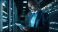 Mężczyzna z tabletem na tle serwerowni, dział IT, cyberbezpieczeńśtwo