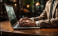 dłonie osoby, dorosłej, starszej, pracującej na komputerze, laptopie przy biurku w biurze.
