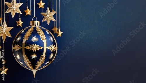 Granatowo-złote tło Bożonarodzeniowe z bogato zdobionymi bombkami, gwiazdkami i miejscem na tekst