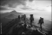 Fototapeta - A group of hikers with backpacks walking on a mountain trail at sunrise