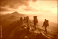A group of hikers with backpacks walking on a mountain trail at sunrise