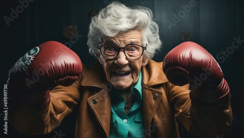 Fototapeta - starsza babcia z radościa w rękawicach bokserskich chętna do boksowania,