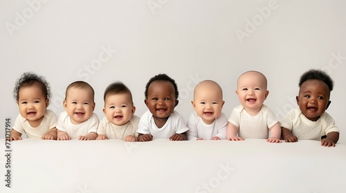 Generative AI : Row of six multi ethnic Babies smiling in studio