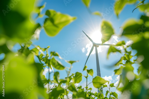 Fototapeta - Windrad mit einem Baum von unten und blauen Himmel