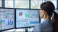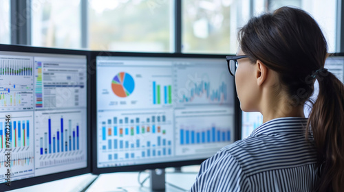 Fototapeta - A female data analyst analyzing data on multiple screen