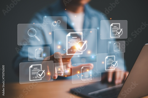 >Plakat>Document audit inspection and business asset analysis concept. Man inspects data, file check with magnifying len. Business analysis, document review, online approval, digital information research