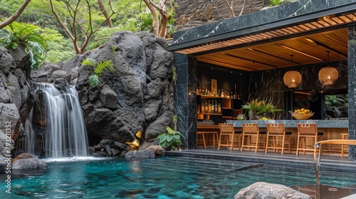 Fototapeta - Exotic bar in an underground cave with a waterfall