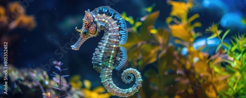 Fototapeta - detailed brown seahorse against a blurred aquatic backdrop, highlighting marine life.