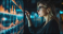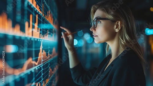 >Plakat>A female businesswoman studies the financial market to calculate possible risks and profits. An economist accounts money with statistics graphs on her desktop computer. She quotes exchange rates on a