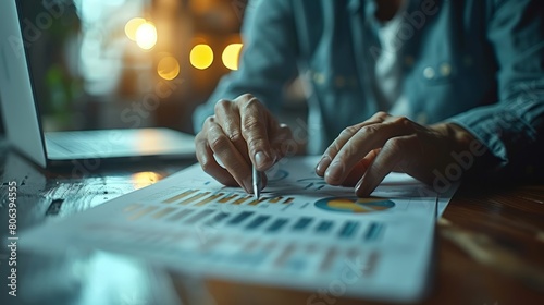 Fototapeta - The concept of a businessman working on a graph chart report in the context of marketing research, development planning, management strategy analysis, and financial accounting.
