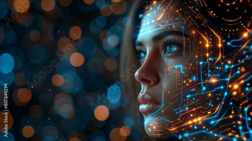 Fototapeta - Web banner design with illustration of human face on hi-tech background for Artificial Intelligence (AI) concept.