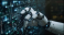 A robotic hand and a human hand are touching a digital graph interface in 3D