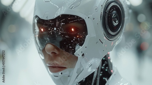 Fototapeta - An augmented reality technology concept of a 3D humanoid robot in a futuristic AI artificial intelligence industry.