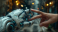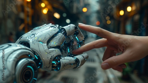 In this concept of harmonious coexistence between humans and artificial intelligence, the human finger taps the metallic finger of a robot.