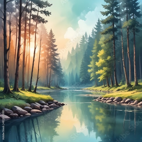 >Plakat>Piękny krajobraz nad rzeką z widokiem na góry. Ilustracja jako obraz na ścianę lub okładka książki oraz do innych kreatywnych projektów. Cudowny efekt farb wodnych