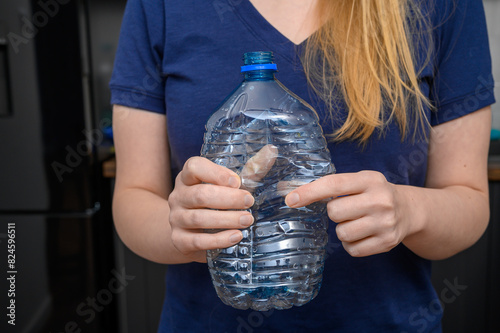 Zużyta plastikowa butelka PET po wodzie zgniatana w dłoniach
