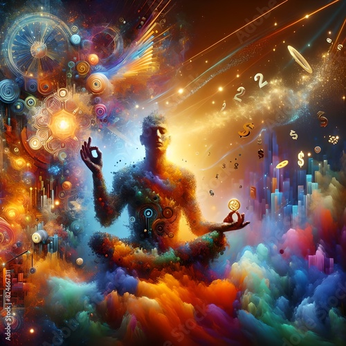 tętniący życiem, wymarzony krajobraz z pływającą wyspą i kaskadowymi wodospadami otoczonymi wirującymi chmurami . Człowiek podczas medytacji.